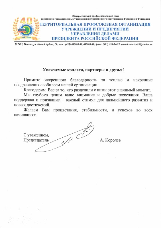 Территориальная профсоюзная организация учреждений и предприятий Управления делами Президента РФ