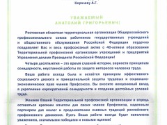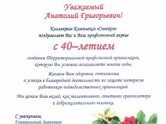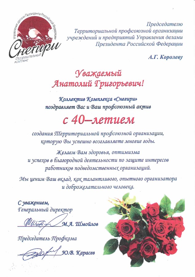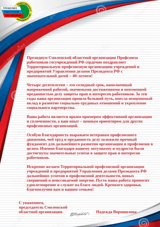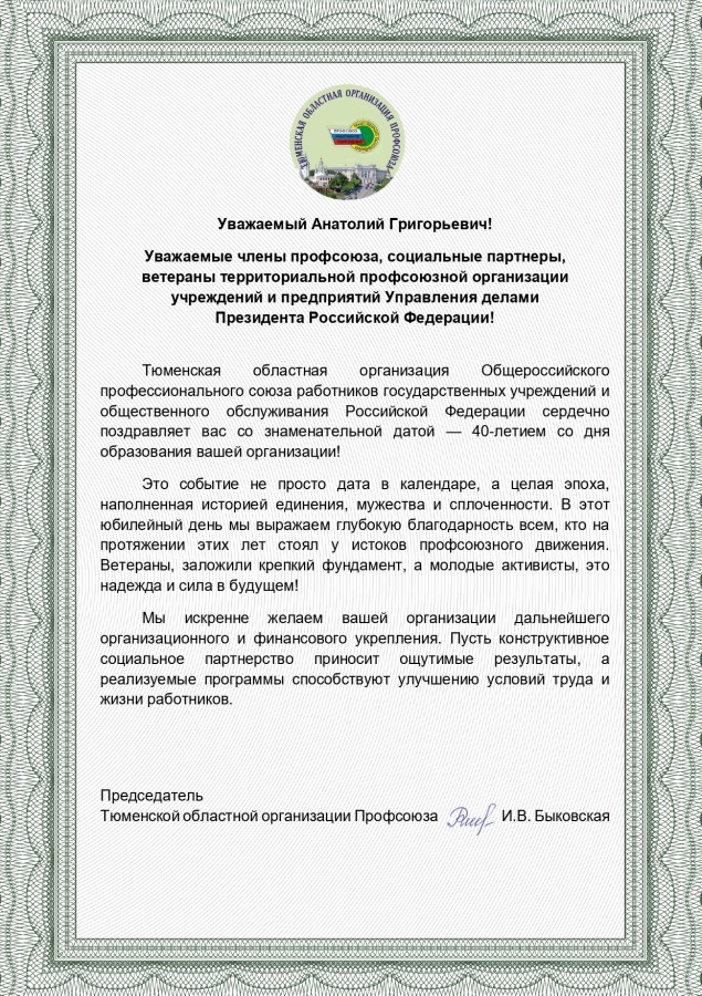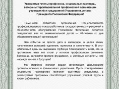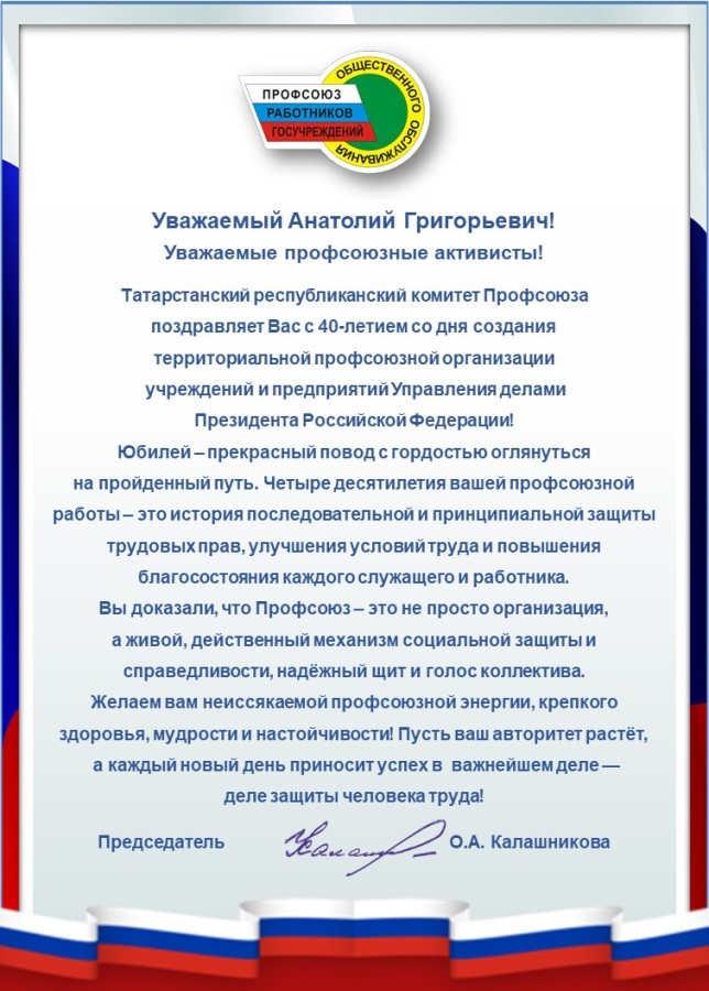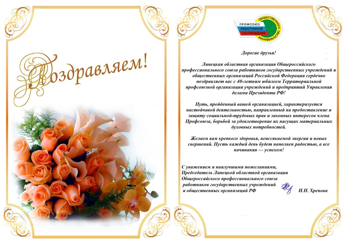 От имени Президиума Территориальной профсоюзной организации учреждений и предприятий Управления делами Президента Российской Федерации поздравляю Вас с этим событием.