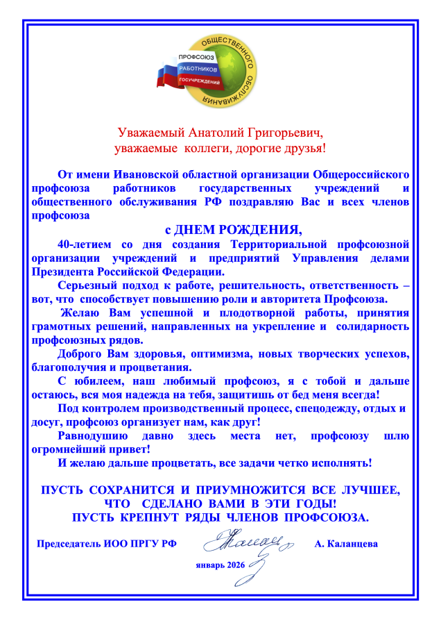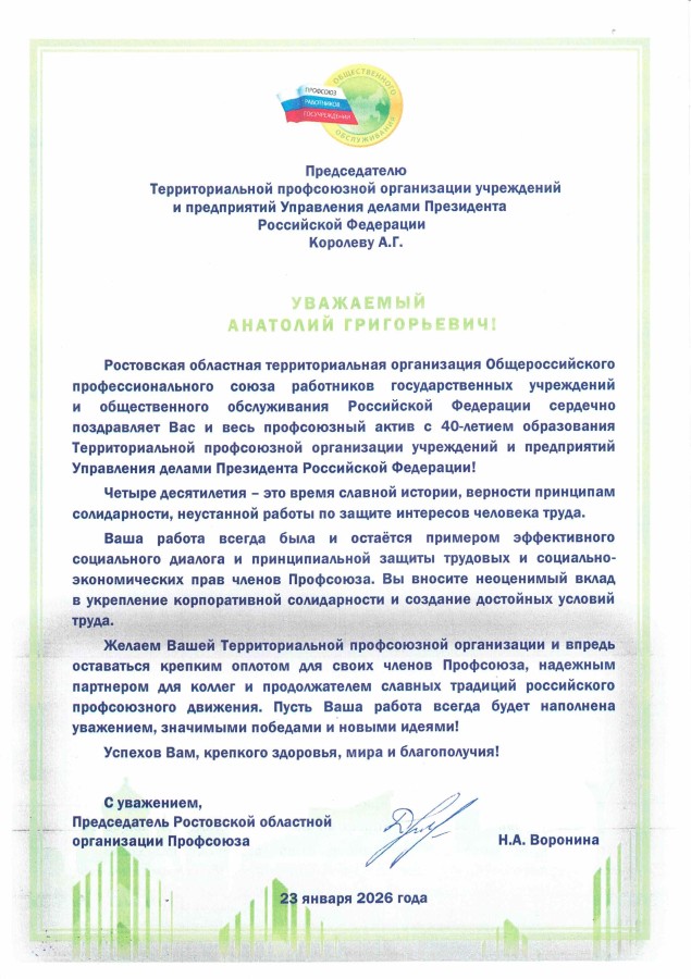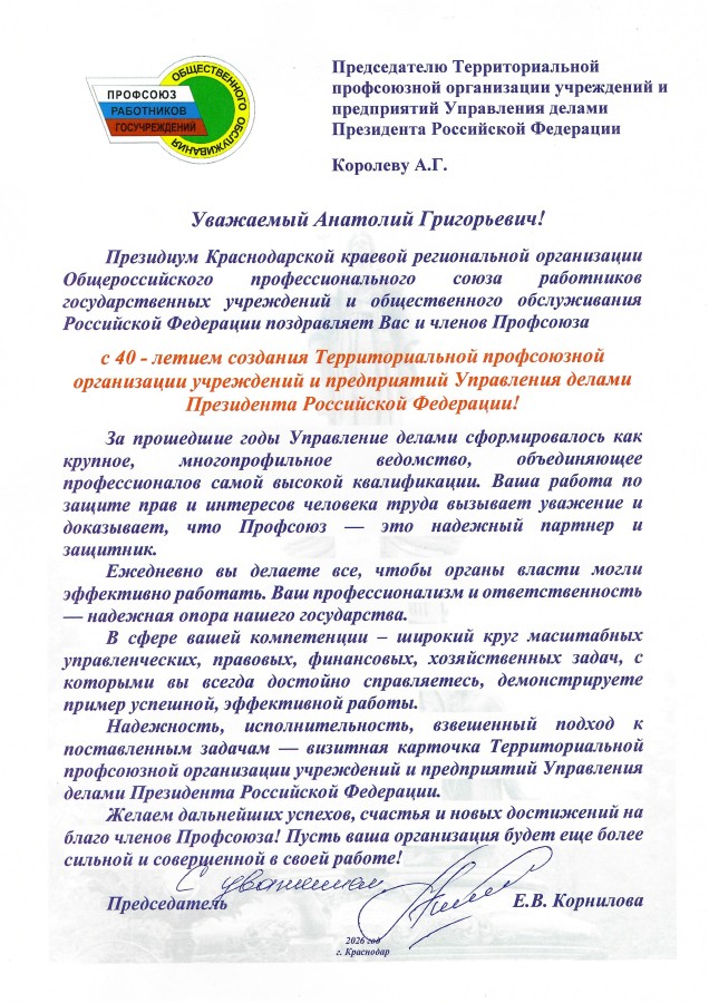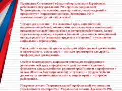 Комитет Территориальной профсоюзной организации учреждений и предприятий Управления делами Президента Российской Федерации поздравляет: